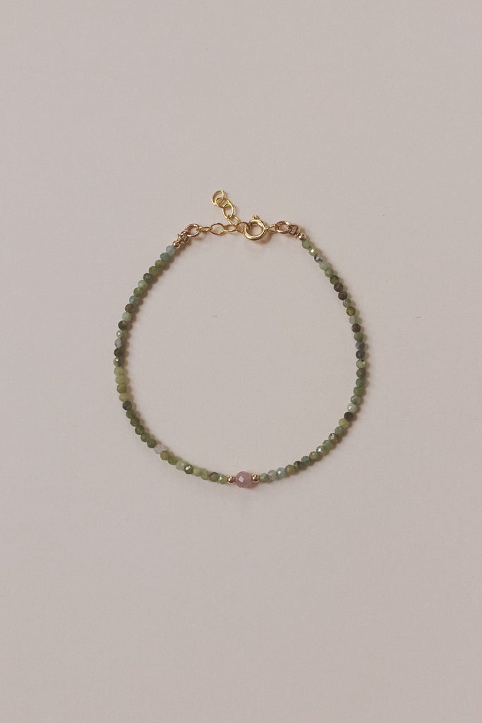 Petite faceted green tourmaline with a petite faceted pink rose quartz stone. A modern heirloom piece, perfect for all occasions. 14k gold-fill.