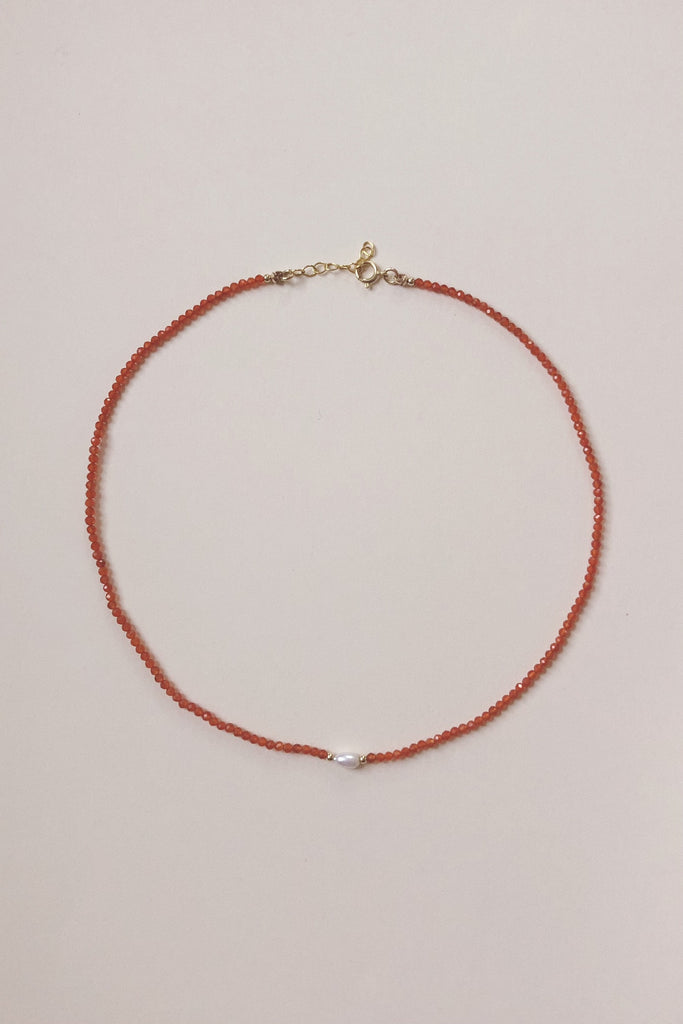 Stunning faceted red-orange petite carnelian and pearl choker necklace. A classic forever piece. 14k gold-fill clasp and extender chain.