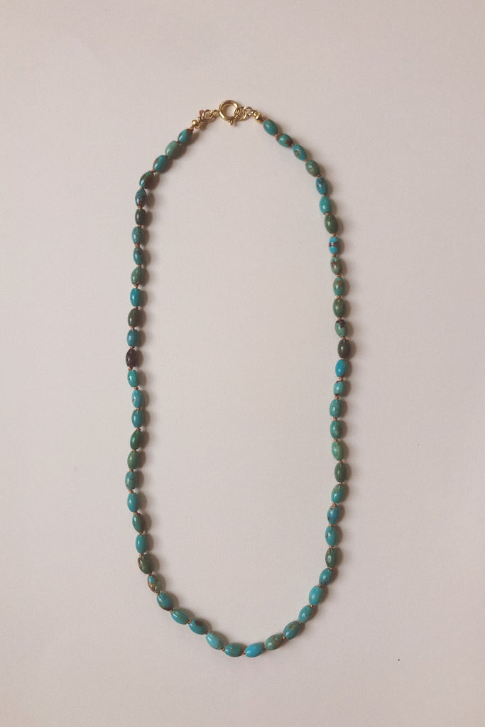 Stunning blue-green + brown barrel cut turquoise and silk knotted necklace with a large spring clasp. A classic forever piece. 14k gold-fill clasp.