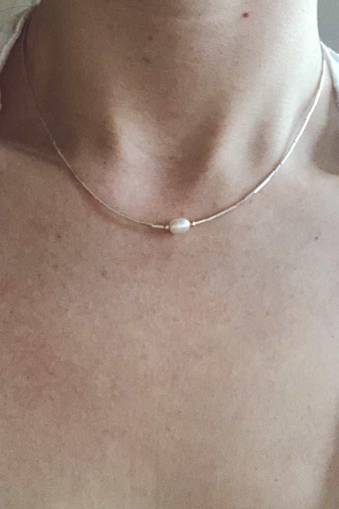 Stunning pearl and sterling silver beaded necklace. A classic forever piece. Sterling silver clasp and extender chain with petite gold-fill accent beads.